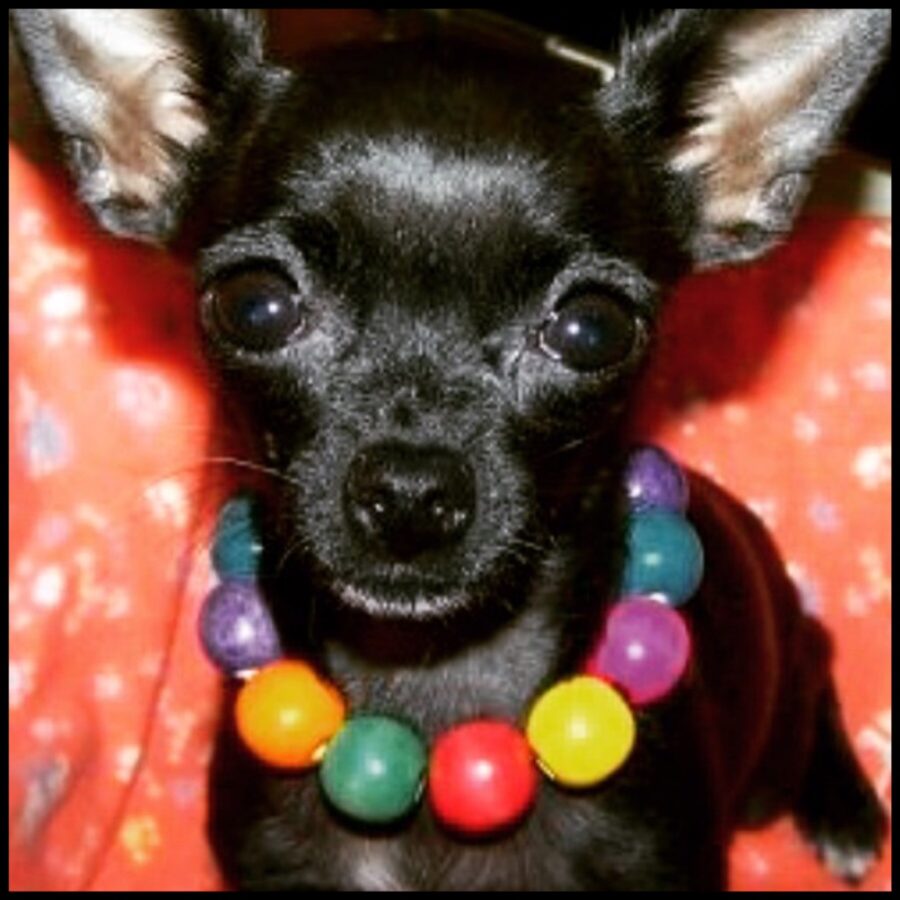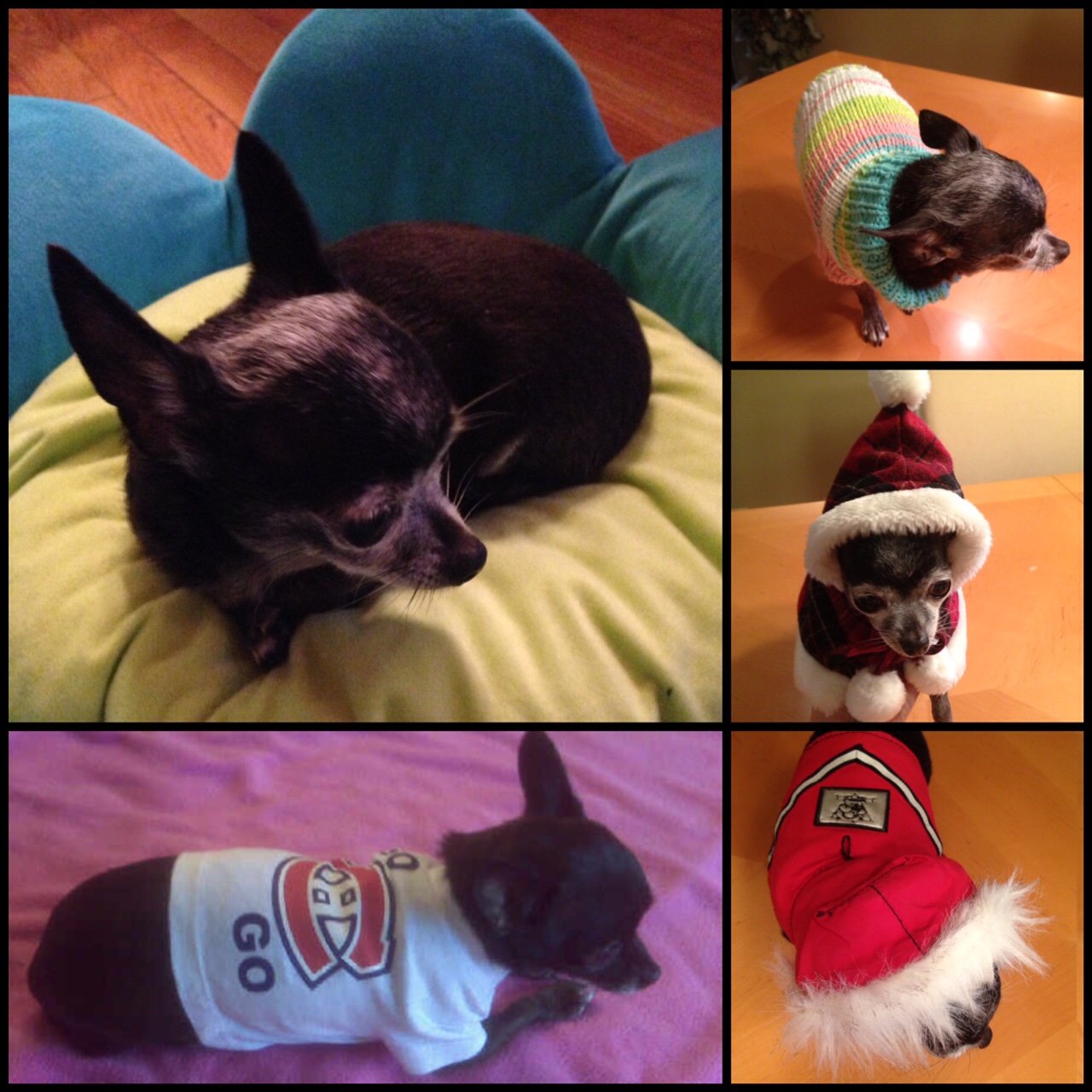 Je vous présente Cassi, ma princesse chihuahua. Elle a 10 ans et pèse 2 livres et demi seulement. Elle était toute noire quand elle était jeune, mais avec le temps elle grisonne sur la tête et le bout des pattes. C’est assez drôle de voir cette petite peanut japper après le facteur du haut de ses 4 pouces de pattes! « Elle ne le sait pas qu’elle est petite et agit comme n’importe quel chien » c’est très drôle, elle me protège comme si elle était un chien Mira! Me promener en laisse avec elle fait sursauter les gens dans la rue, en fait ils se demandent ce qu’il y a au bout de ma laisse hihi! Comme elle est très petite et frileuse, j’ai dû lui acheter quelques vêtements pour ses sorties à l’extérieure l’automne, ce qui fait sourire tout le monde quand on la voit dans son manteau « style Kanuk ou son kit de sport en velours». Disons que c’est plutôt un chien d’intérieur, même l’été elle cherche toujours à s’emmitoufler. Très colleuse et affectueuse, elle ne rate jamais une occasion de s’installer sur nos genoux lorsque nous écoutons la télévision. Elle est adorable, c’est notre petite boule d’amour de la maisonnée…