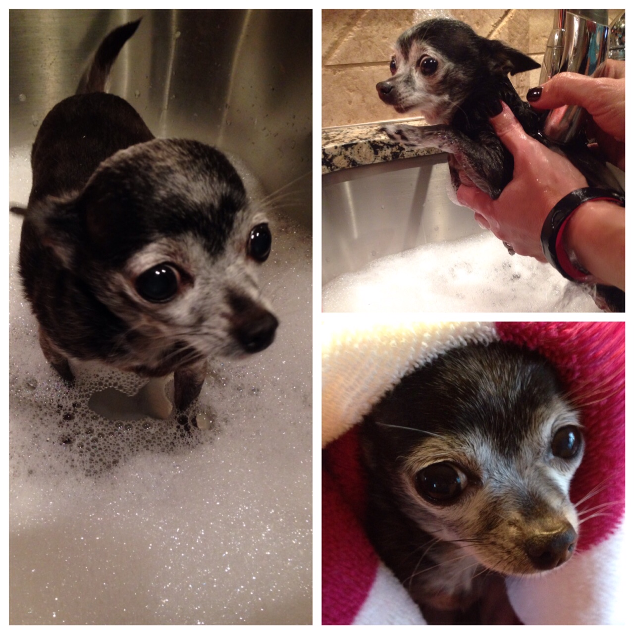 Pour le nettoyage de ma belle Cassi j’ai tout simplement rempli mon lavabo d’eau tiède (36-37 °C) jusqu’à la bedaine et versé dans ma main le shampoing. Un peu apeurée, j’ai dû la rassurer et surtout faire vite parce qu’elle n’est pas tellement habituée au trempage puisque j’utilise plus souvent un shampoing sec : Un vrai bébé j’vous dis… Pas eu besoin de lui mettre le démêlant puisqu’elle a les poils courts, mais je vous recommande de le faire si votre chien a les poils un peu plus longs. On dit aussi de peigner toutou avant et après le lavage. Un bon rinçage et hop! Cassi enroulée dans une serviette pour bien l’assécher avant de lui faire un mini brossage. Il est important de sécher l’animal comme il faut pour ne pas laisser d’eau au fond du pelage afin d’éviter de développer une infection de peau due à l’humidité. Wow! Je n’ai jamais eu un si beau résultat, le pelage brille et elle sent bon le coconut-lime!