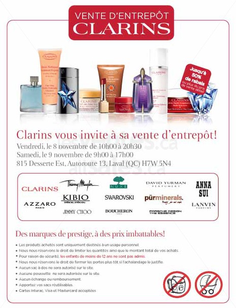 Cette semaine, une autre marque chouchou vous offre de supers rabais! En effet, Clarins ouvrira ses portes au grand public vendredi et samedi, les 8 et 9 novembre. Et pas seulement pour leurs merveilleux produits pour la peau, mais aussi pour plusieurs autres marques et produits de parfumerie. Quelques noms: Nuxe, Thierry Mugler, Azzaro, Lanvin, Jimmy Choo. Comme cette vente est très populaire, je vous conseille d’y aller tôt.