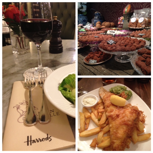 C’est tellement beau cette ville; je suis tombé en amour avec l’architecture et les gens qui sont très sympathiques. Je suis allée au populaire Pub Sherlock Holmes et mangé mon fish and chips de la semaine; c’était délicieux! Une cousine de la “fesse gauche” nous a amenés prendre l’apéro chez Gordon wine bar, où tu prends ton verre à la chandelle dans une grotte. J’ai adoré ça… la vraie “crowd de Londres ” pas de touristes. J’ai mangé au chic HARRODS et acheté des truffes chez L’ETO et fait du shopping de bottes, puisque Londres est le paradis des bottes et chaussures! C’est la ville des bottes cavalières et évidemment je m’en suis procuré une paire, plus une paire de bottes d’eau et une paire hyper fashion. Elles ont l’air bizarres, mais sont très confortables.